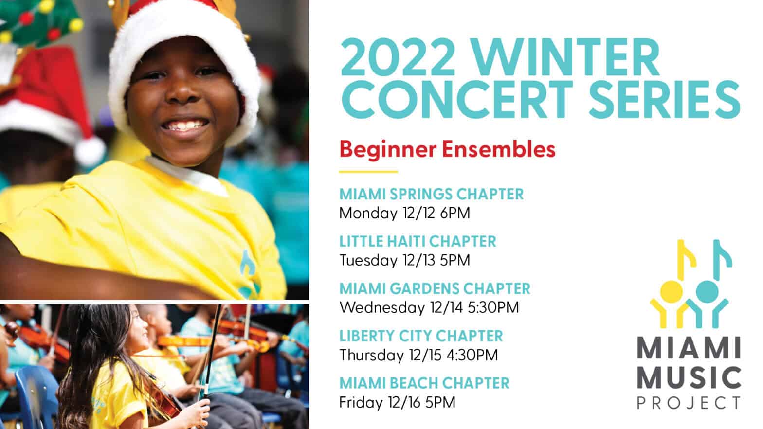 We’re celebrating the holidays with our 2022 Winter Concert Series! Join us on Friday at 5:00pm for a concert featuring Miami Music Project’s talented Children’s Orchestras at our Miami Beach Chapter. Our students will delight you with lighthearted holiday tunes they’ve been rehearsing all month long. They can’t wait to share their hard work with friends, family, and supporters!